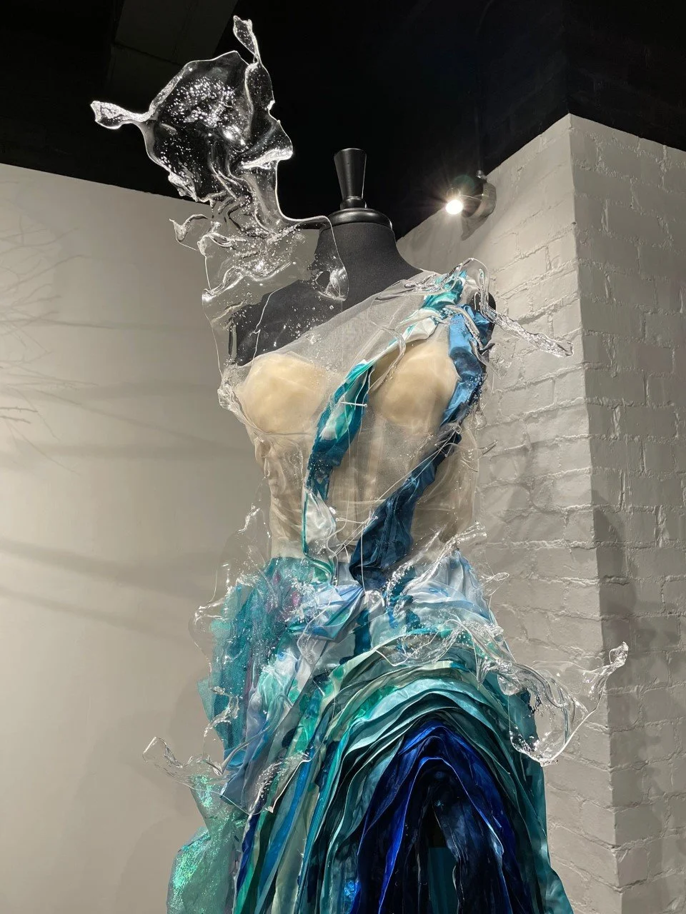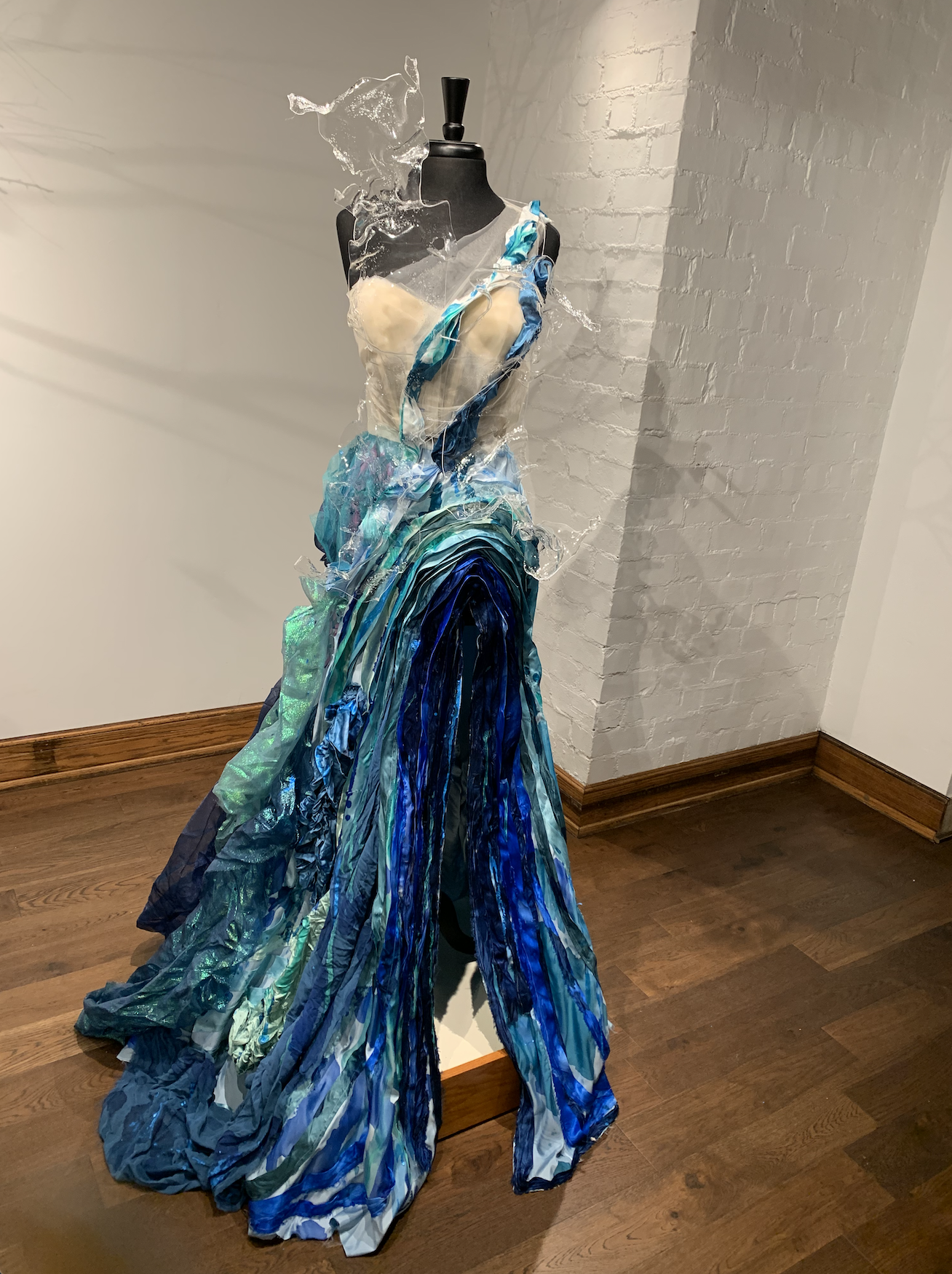 This garment is based on sustainability and ocean pollution. The goal with this garment is to bring attention to plastic pollution within the ocean as well as a lack of sustainability in the fashion industry. The entire garment has been created out of recycled fabric and plastics.